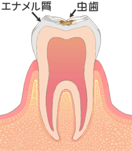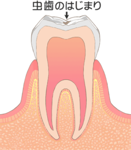 歯の表面のエナメル質が溶け始め、白く濁った状態が見られます。この段階ではまだ歯に穴はありませんし、痛みなどの自覚症状もありません。