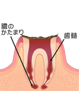 歯の大部分が溶けて失われ、歯根まで虫歯に侵された状態です。神経が死んで痛みはなくなりますが、歯根部に膿がたまると再び痛みが生じます。