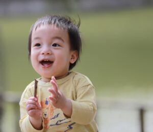 楽しみながら「ばあっ!」と大きく口を開けて笑顔を見せると、赤ちゃんも大口を開けて笑ったり、真似をしたりするので、楽しめます。